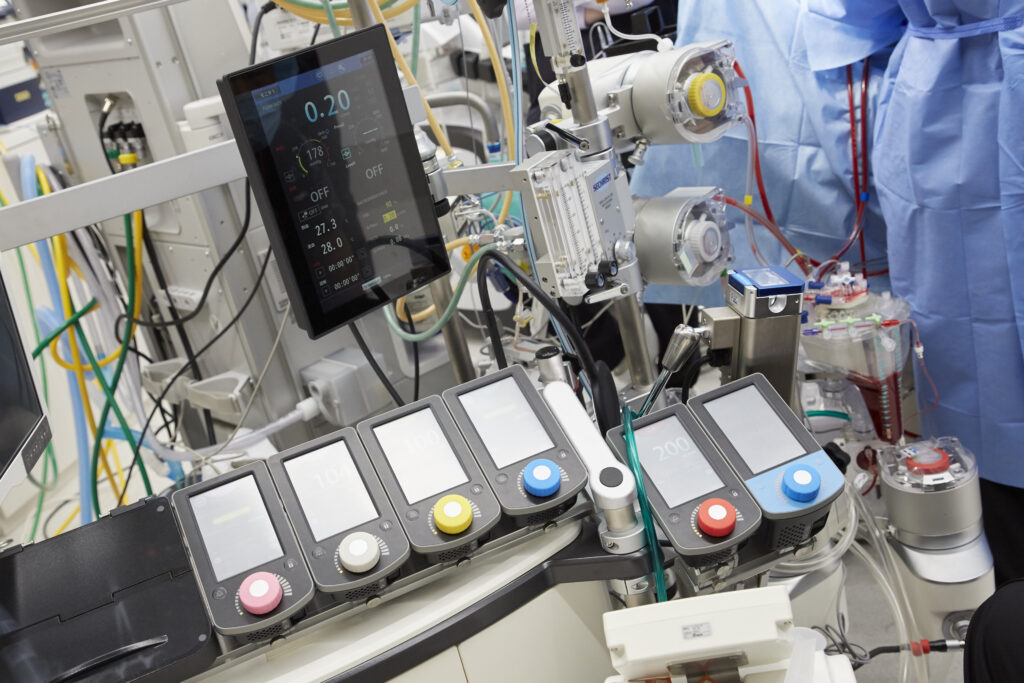 小型犬では血液量が少なく、少量の出血や輸液、微量の薬の調整で循環変動が起こりやすく、きめ細かなモニタリングが重要です。酸素飽和度、血圧、心拍数、体温に加え、動脈カテーテルを用いた血圧モニタリングを行い、尿道カテーテル留置により尿量も指標として循環動態の把握に努めます。循環器外科の麻酔ではすべての水分の出入りを記録して、循環維持のために微量点滴や昇圧薬などの特殊薬を使用します。