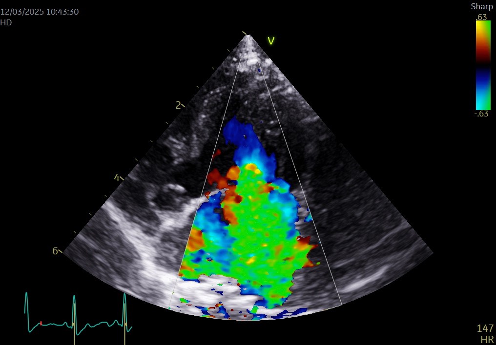 心臓超音波検査では僧帽弁閉鎖不全症とそれに伴う心拡大が確認されました(LA/Ao 2.0)。