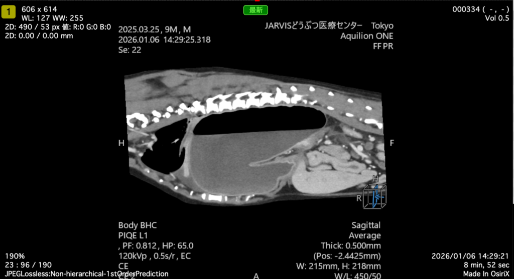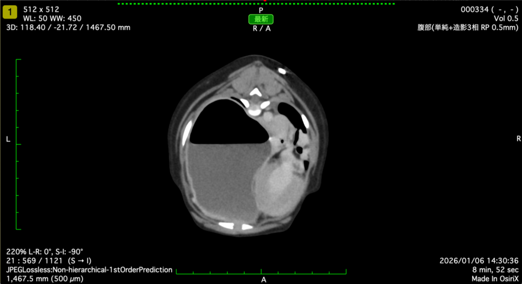 本症例は夜間に呼吸促迫と元気消失を主訴に紹介受診し、画像検査で原因精査を行いました。CT検査では胃が胸腔内へ脱出し、中等度に拡張して肺を強く圧排していました。また、左肺の虚脱と軽度の気胸がみられ、呼吸機能低下が懸念される所見でした。脾臓には造影増強の乏しい領域があり血流障害が疑われ、膵臓は不均一な造影増強と周囲脂肪の変化から浮腫/膵炎の併発にも注意が必要と判断しました。