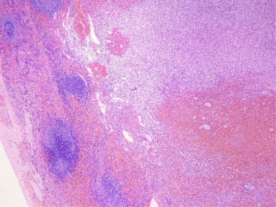 ▲病理結果:リンパ濾胞様組織の過形成性増殖巣から形成され、腫瘤内の赤脾髄は血液の貯留や髄外造血により中度に拡張している。腫瘍性増殖を示す細胞や、感染性病原体は認めない。